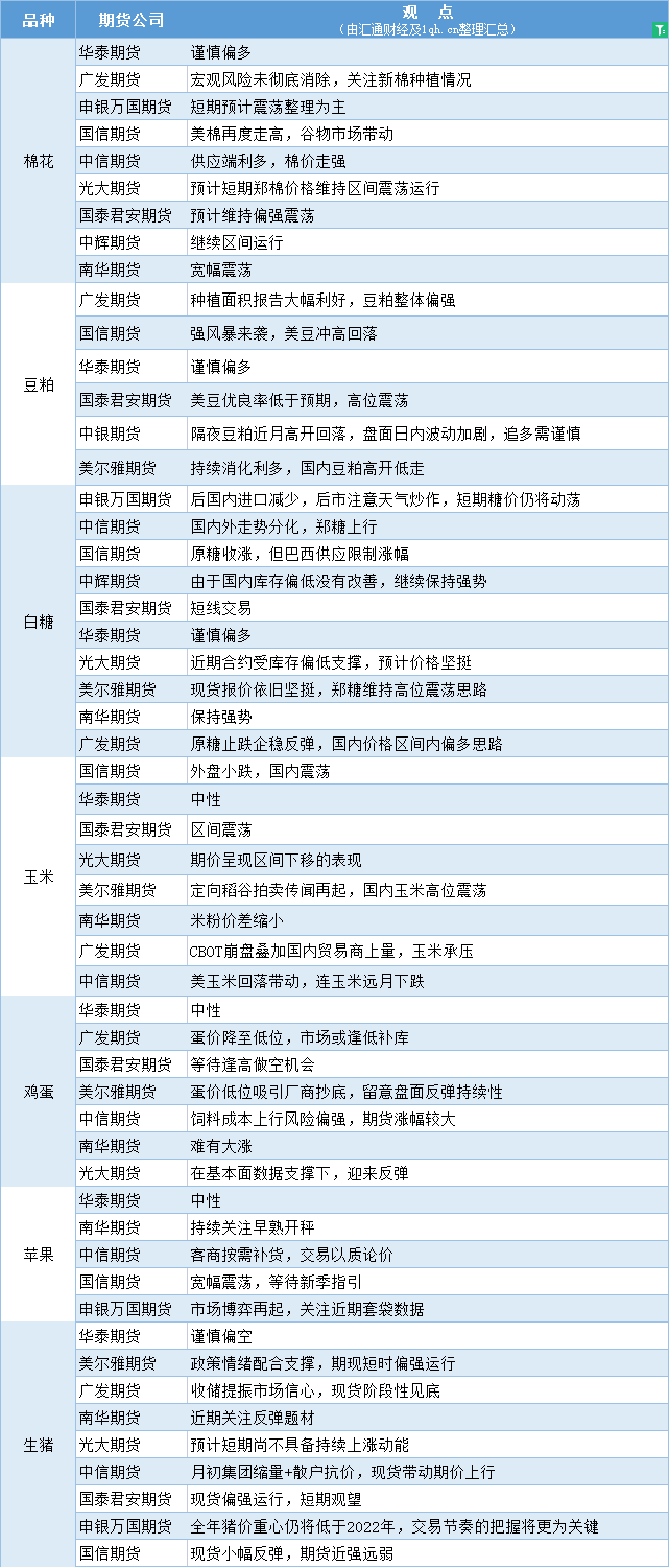 汇通财经APP讯——期货公司观点汇总一张图:7月4日农产品(棉花、豆粕、白糖、玉米、鸡蛋、生猪等)