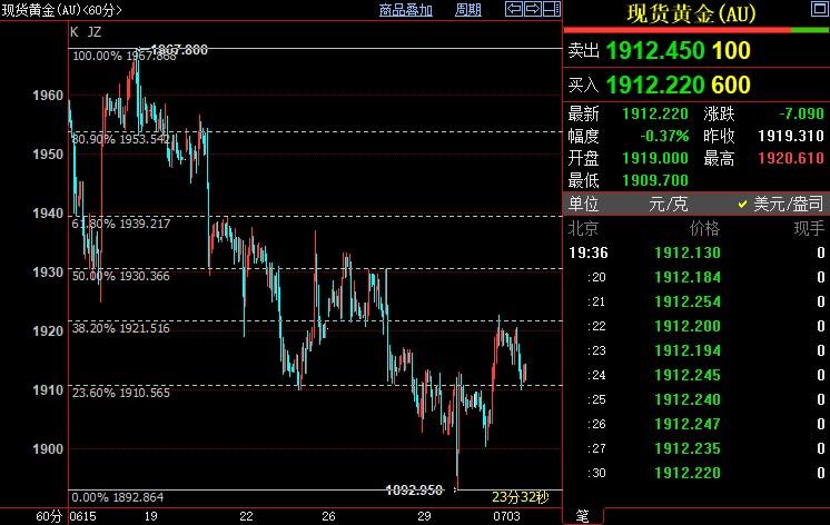 北京时间20:18,现货黄金下跌0.35%至1912.22美元/盎司;COMEX期金主力合约下跌0.49%至1920.0美元/盎司;美元指数上涨0.21%至103.132。