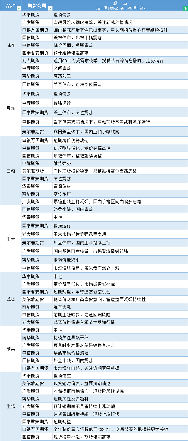 汇通财经APP讯——期货公司观点汇总一张图:7月5日农产品(棉花、豆粕、白糖、玉米、鸡蛋、生猪等)