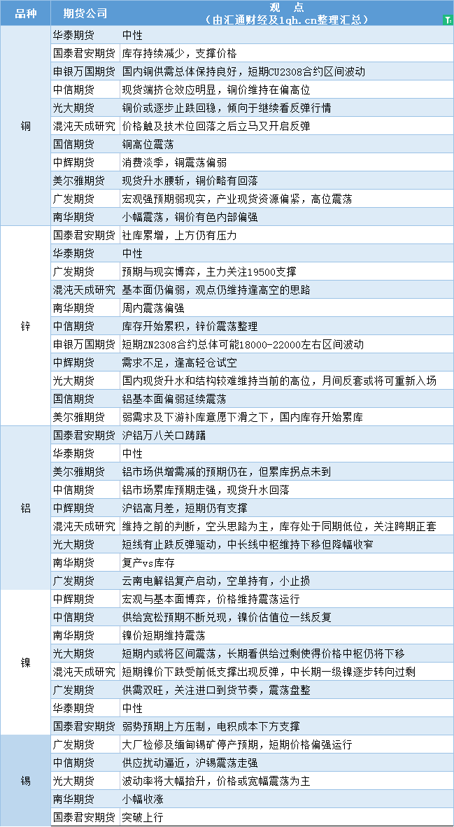 汇通财经APP讯——期货公司观点汇总一张图:7月5日有色系(铜、锌、铝、镍、锡等)