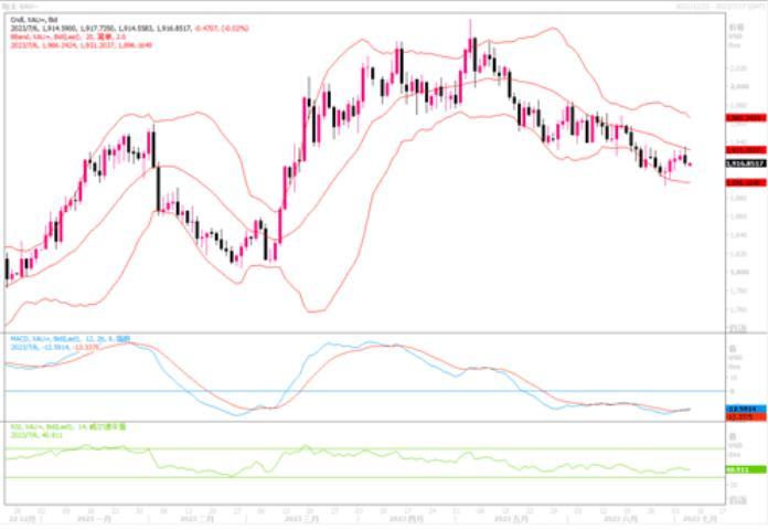 汇通财经APP讯——周三(7月5日),受美联储鹰派的会议纪要影响,现货黄金在窄幅波动中出现冲高回落行情,当日下跌0.53%,全日以最低1914.60美元/盎司水平收盘。