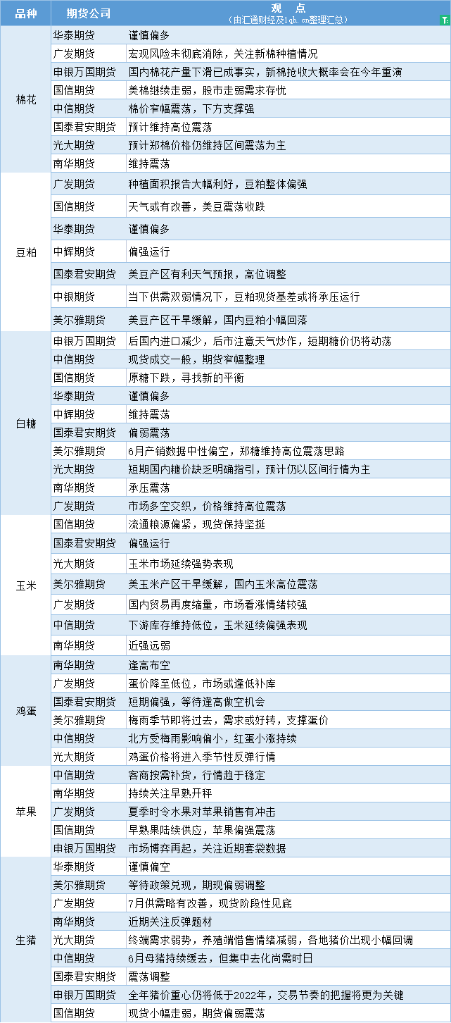 汇通财经APP讯——期货公司观点汇总一张图:7月7日农产品(棉花、豆粕、白糖、玉米、鸡蛋、生猪等)