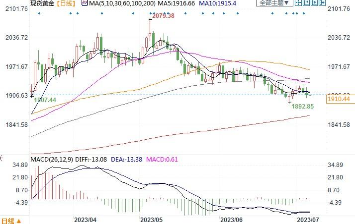 北京时间7月7日11:02,现货黄金报1910.83美元/盎司