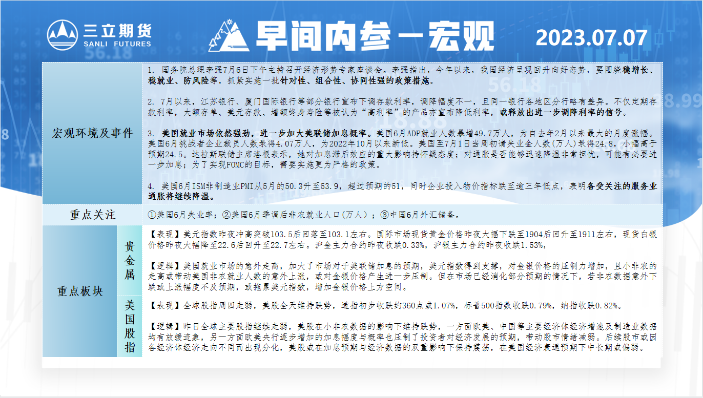汇通财经APP讯——三立期货早间内参显示,美国就业市场的意外走高,加大了市场对于美联储加息的预期,美元指数得到支撑,对金银价格的压制力增加,且小非农的走高或带动美国非农就业人数的意外上涨,或对金银价格产生进一步压制。但在市场已经消化部分预期的情况下,若非农数据意外下跌或上涨幅度不及预期,或拖累美元指数,增加金银价格上方空间。