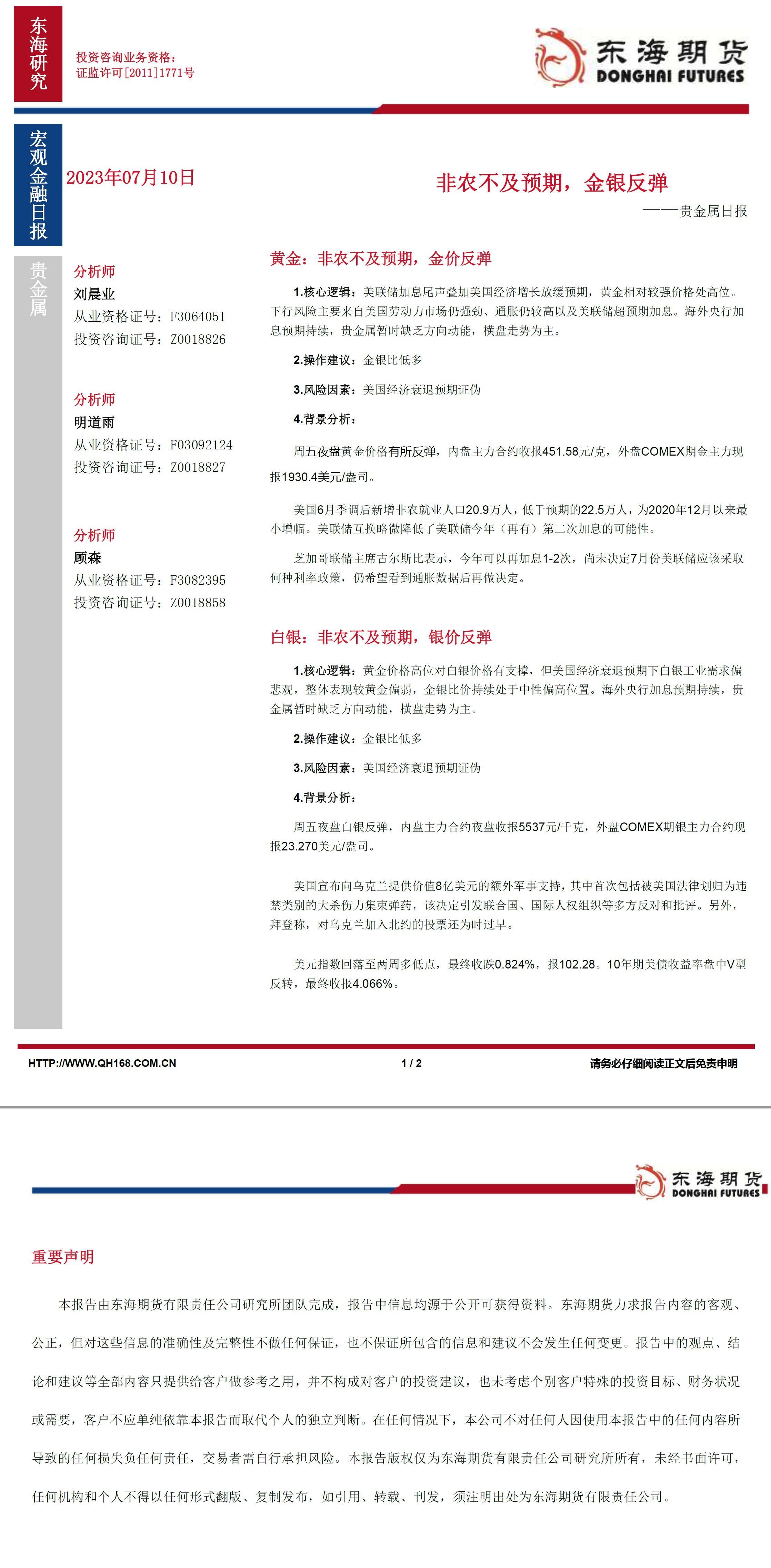 标题:【东海期货7月10日产业链日报】贵金属篇:非农不及预期,金银反弹