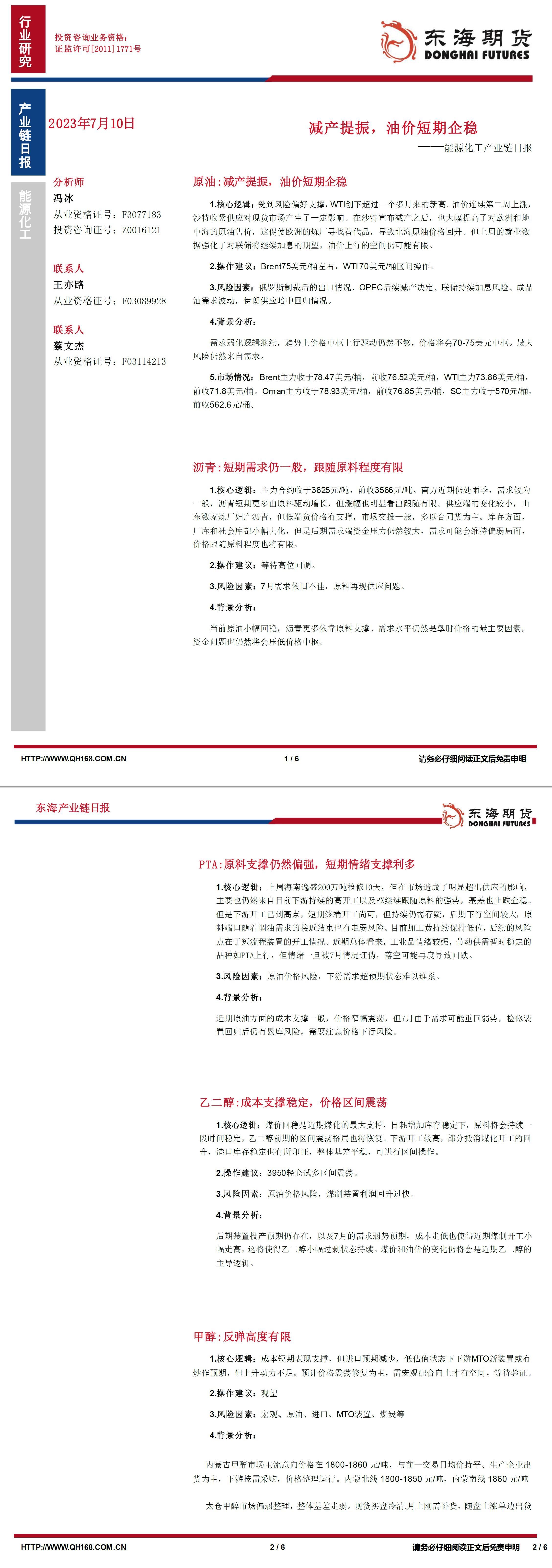 标题:【东海期货7月10日产业链日报】能化篇:减产提振,油价短期企稳