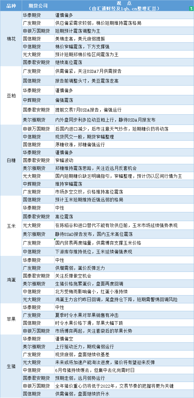汇通财经APP讯——期货公司观点汇总一张图:7月11日农产品(棉花、豆粕、白糖、玉米、鸡蛋、生猪等)