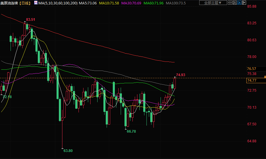 商品收盘情况:美国期金上涨0.3%,报1937.10美元。布伦特原油期货结算价报每桶79.40美元,上涨2.2%。美国原油期货上涨2.5%,结算价报74.83美元。