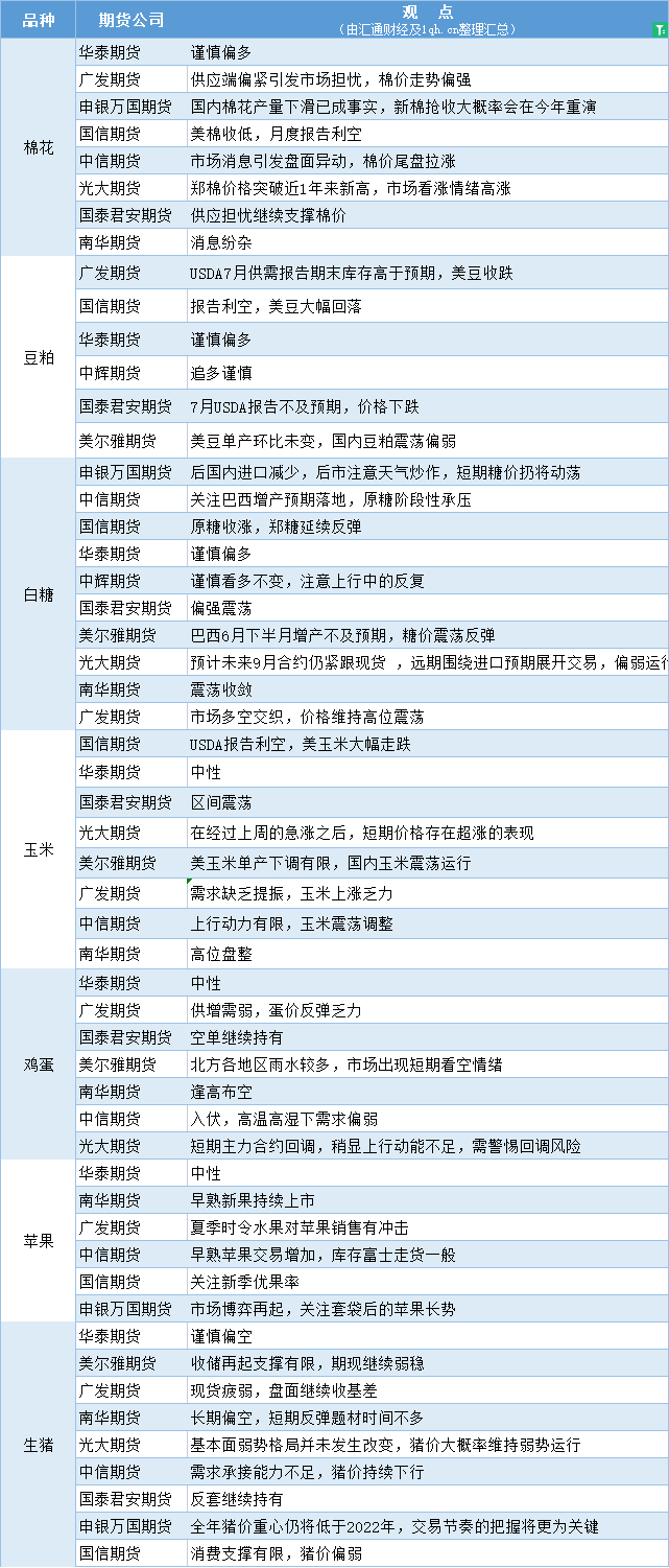 汇通财经APP讯——期货公司观点汇总一张图:7月13日农产品(棉花、豆粕、白糖、玉米、鸡蛋、生猪等)