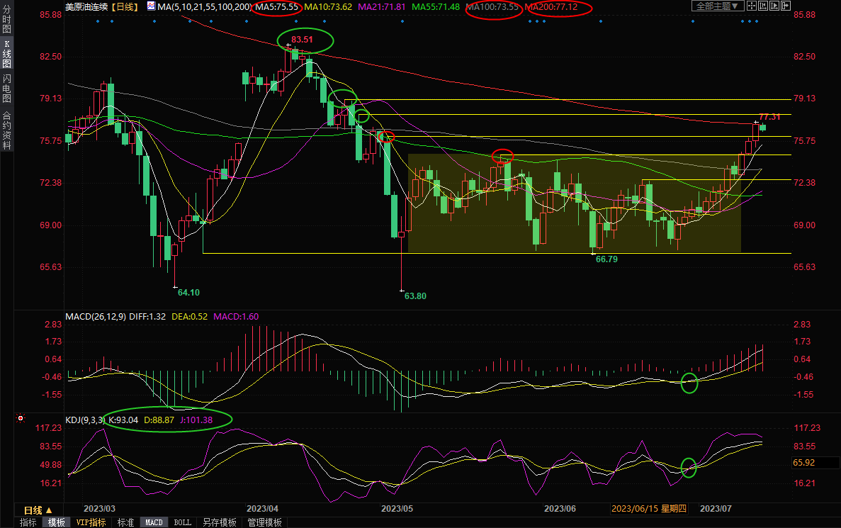 由于MACD金叉良好,短期均线多头排列,5日均线上穿100日均线,21日均线上穿55日均线,若能守住74.71附近支撑,则后市仍偏向多头,而且需要提防回调力度不及预期的可能性,初步阻力参考200日均线77.12附近位置,进一步阻力参考4月26日高点77.90附近位置,4月24日高点阻力在79.15附近,然后是80整数关口附近阻力。