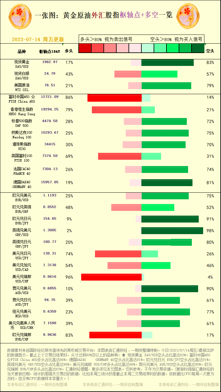 标题:一张图:2023/07/14黄金原油外汇股指"枢纽点+多空占比"一览