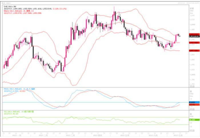 技术层面上,从黄金日线图来看,黄金买家在略低于6月16日高点1968美元/盎司的位置停滞不前。与此同时,14日相对强弱指数(RSI)已停止上升并趋于平缓,表明金价上冲动能有所减弱。目前,金价短期支撑在50日移动均线和100日移动均线汇合处(在1954美元/盎司);一旦跌破这一水平,不能排除金价急剧跌向1940美元/盎司支撑区域的可能性。再往下看,1932美元/盎司可能会受到考验。另一方面,若金价持续突破6月16日高点1968美元/盎司,这将为金价升向6月2日高点1984美元/盎司打开大门。如果金价获得额外的上行牵引力,黄金买家届时将瞄准2000美元/盎司关口。