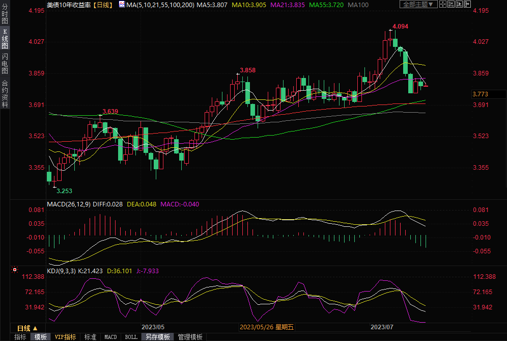10年期国债收益率周一小幅下跌至3.810%,数据公布前为3.824%左右。该收益率7月7日曾触及八个月最高的4.094%。对利率敏感的两年期国债收益率周一持于4.750%,7月6日曾触及5.12%的2007年6月以来最高。