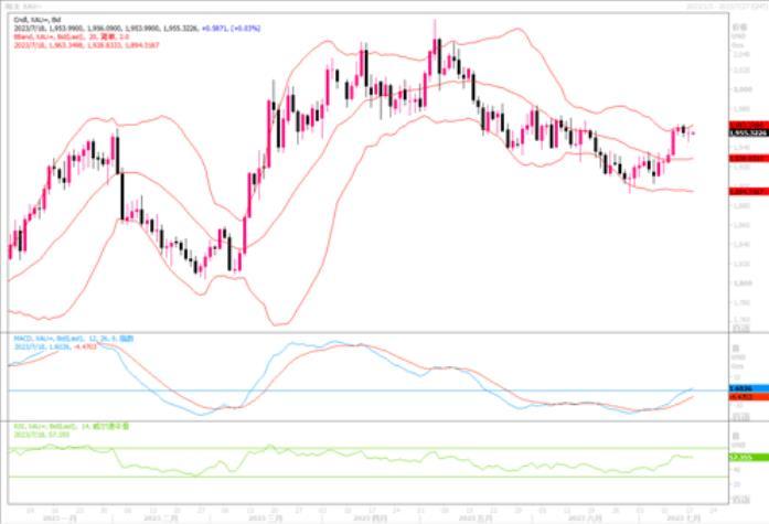 技术层面上,国际黄金周一维持窄幅震荡走势,日线最终收盘在1955美元的位置后行情以一根下影线稍长于上影线的长脚阳十字星形态收线,当前金价仍处于日线60日均线压力位价格下方。随着反弹压力位整理加剧日线移动平均线向上交叉排列,维持底部反转走势。小时线显示,短线顶部整理周期延长形成金价向下破位小时线移动平均线支撑位,小时线移动平均线呈向下交叉排列,短线冲高乏力呈偏震荡下行走势,高位回调预期有所升温。考虑到下周将迎来美联储7月利率会议,在该事件的牵扯下,预料黄金暂时缺乏继续冲高的动能。短线还是以防回落调整风险为主。