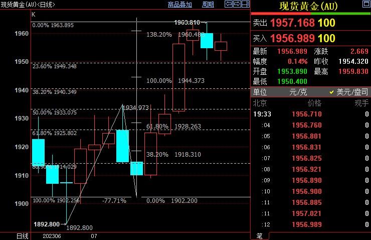 北京时间20:19,现货黄金上浮0.10%至1957.19美元/盎司;COMEX期金主力合约下跌0.16%至1961.3美元/盎司;美元指数下跌0.07%至99.885。