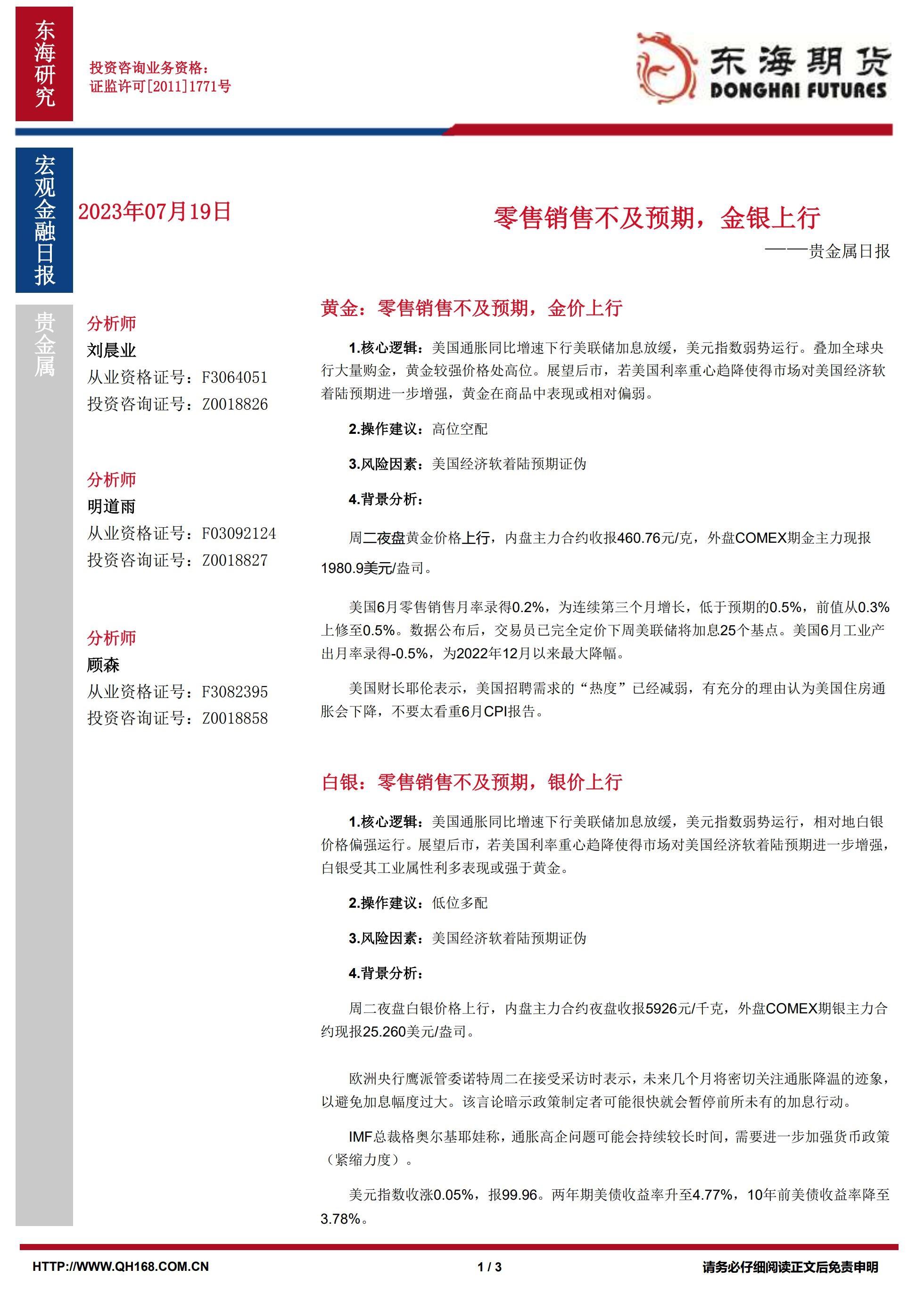 标题:【东海期货7月19日产业链日报】贵金属篇:零售销售不及预期,金银上行