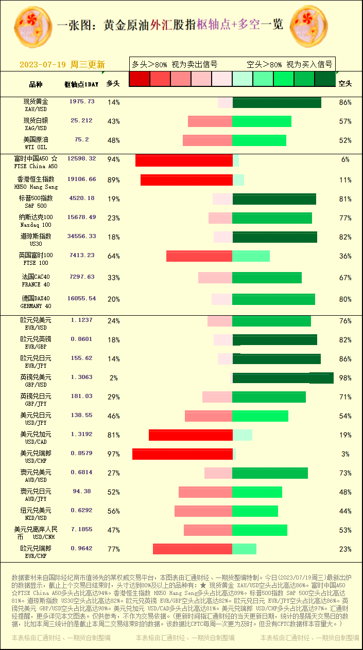 标题:一张图:2023/07/19黄金原油外汇股指"枢纽点+多空占比"一览