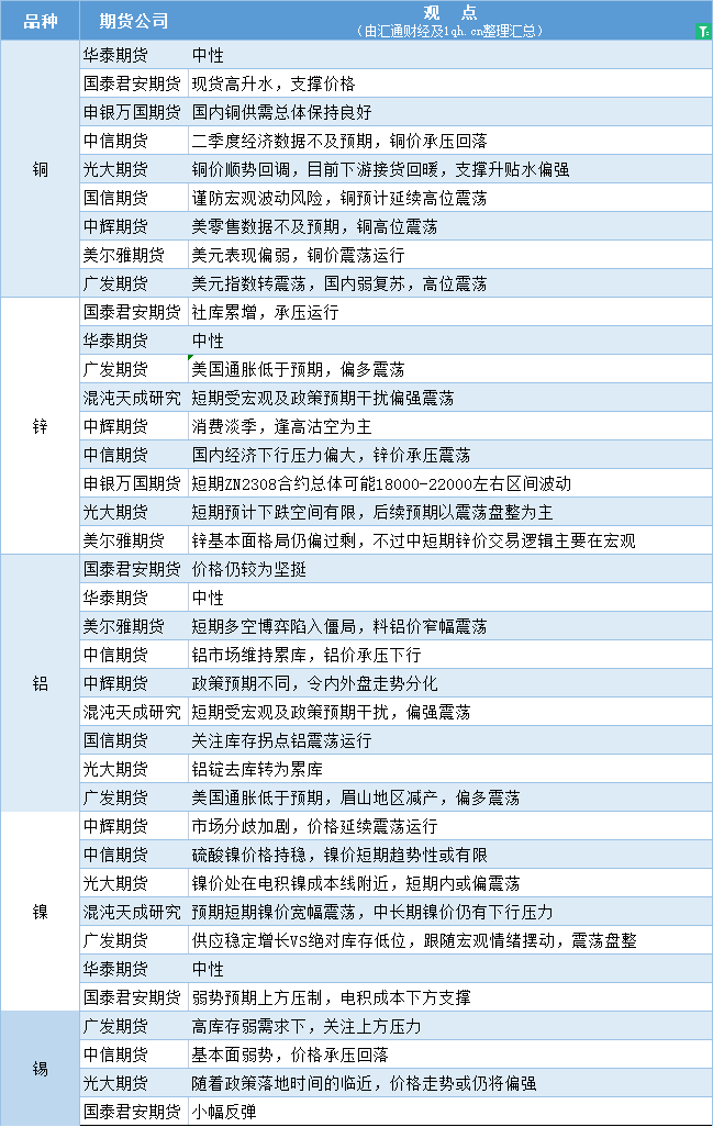 汇通财经APP讯——期货公司观点汇总一张图:7月19日有色系(铜、锌、铝、镍、锡等)