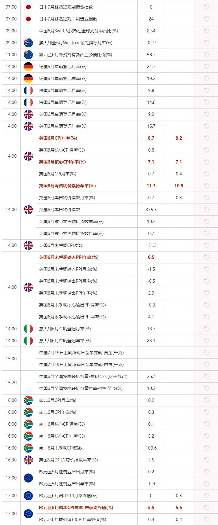 14:00 英国6月核心CPI年率(%) , 前值 7.1 , 预期值 7.1 , 公布值:待发布