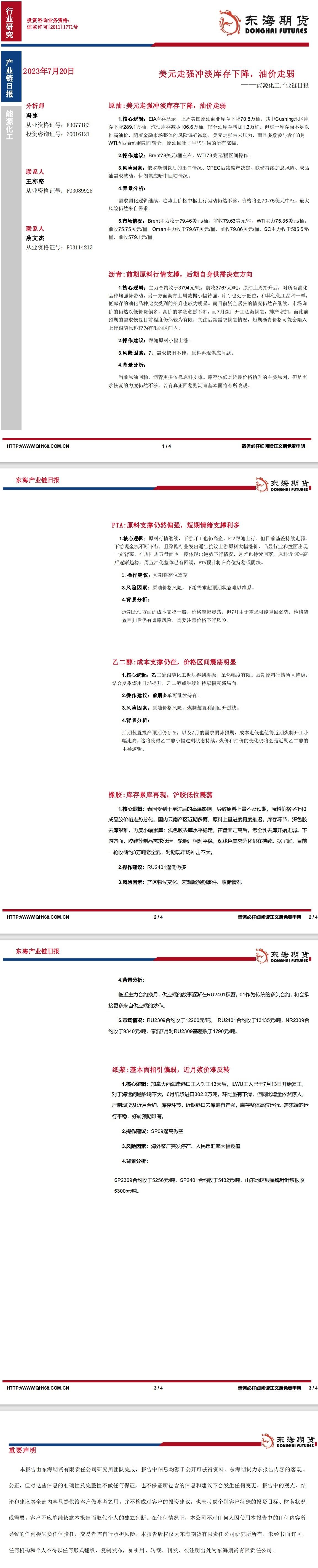 标题:【东海期货7月20日产业链日报】能化篇:美元走强冲淡库存下降,油价走弱