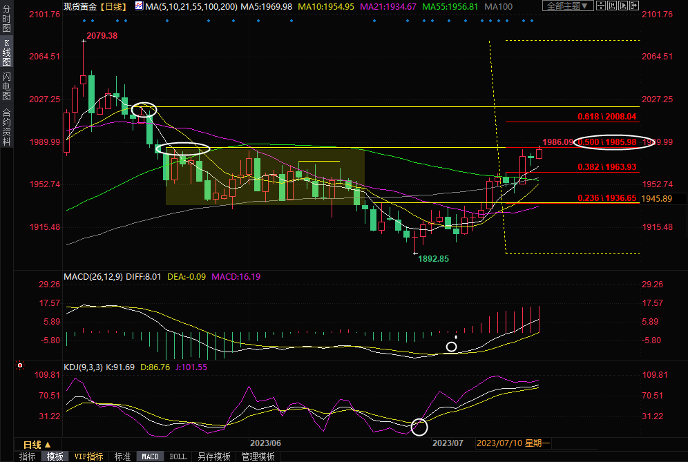 汇通财经APP讯——周四(7月20日)亚洲时段,现货黄金震荡上涨,一度创5月17日以来新高至1986.09美元/盎司,目前交投于1984.86美元/盎司附近,因市场押注美联储可能很快结束升息周期,美元指数回吐隔夜涨幅,给金价提供上涨动能,重点关注2079-1892跌势50%回撤位1985.93的关键位置,若站稳该位置,则金价或将进一步上涨至2000关口上方。