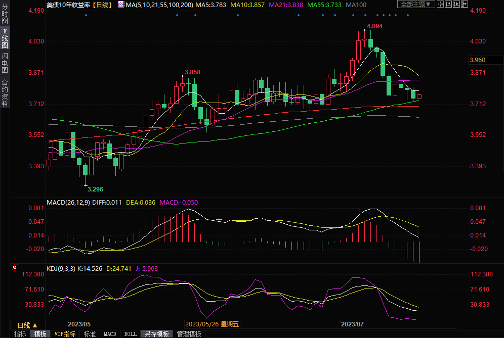 10年期国债收益率周三下跌4.5个基点至3.744%,7月7日曾触及八个月高位4.094%。两年期国债收益率周三小幅上扬1.1个基点,至4.763%,在上午的新屋开工数据公布后一度短暂下跌。但目前仍低于7月6日触及的2007年6月以来最高的5.120%。