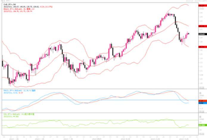 周四(7月20日)美元兑日元继续攀升0.29%,报收于140.07,盘中最高触及140.49。日本政府周四预测,今年通胀将大幅高于央行设定的2%的目标,并承认物价上涨范围扩大可能会让市场继续预期超低利率将结束。但是由于当日美国失业申请救济人数意外减少,美元受刺激抬升,继续在兑日元的走势上施压日元。短期内美元利率是否在7月份之后仍有继续上调余地的猜测,将会继续左右着美元兑日元的走势。由于日本央行在货币政策上仍丝毫未现有收紧的迹象,恐会继续不利于日元价值回升。日线图上,美元兑日元回升之5、10日短期均线之上,但仍受压在20日均线下方,整体上尚不足证美元兑日元就此进入反转态势,更多地只是短期空头回补的技术性调整交易而已。上方昨日的高点140.49是较为重要的阻力水平,若继续穿越,进一步将考验141,进而是142。目前日元转而回强的元素较为缺乏。