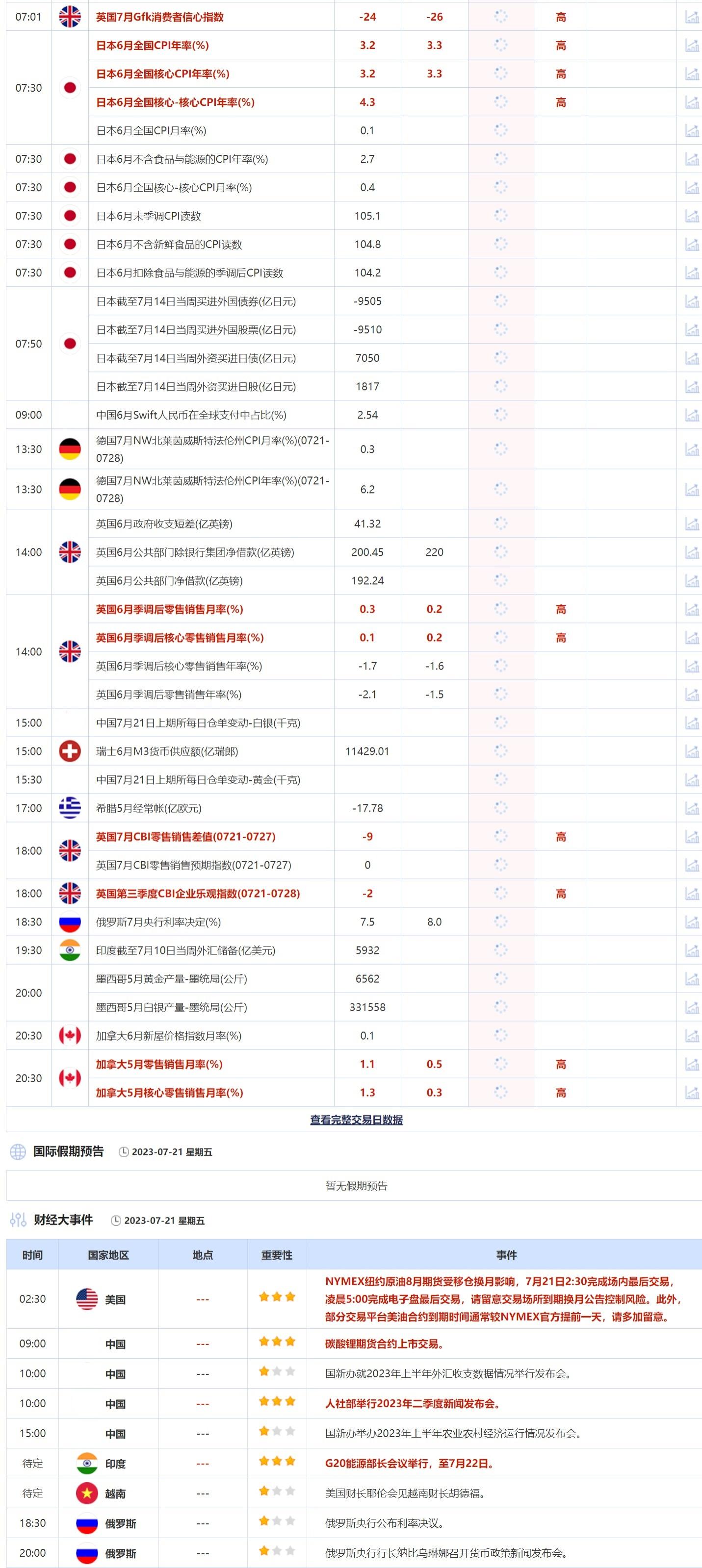 汇通财经APP讯——7月21日,投资者需要关注的重点数据:日本6月全国CPI年率,日本6月全国核心CPI年率,日本6月全国核心-核心CPI年率,英国6月季调后零售销售月率,英国7月CBI零售销售差值,英国第三季度CBI企业乐观指数,加拿大5月零售销售月率。需要关注的大事件包括G20能源部长会议举行,至7月22日;碳酸锂期货合约上市交易。