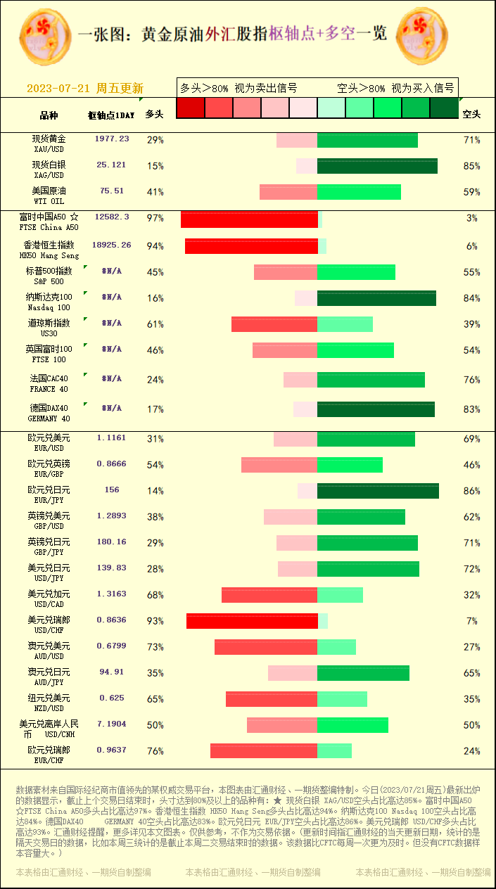标题:一张图:2023/07/21黄金原油外汇股指"枢纽点+多空占比"一览