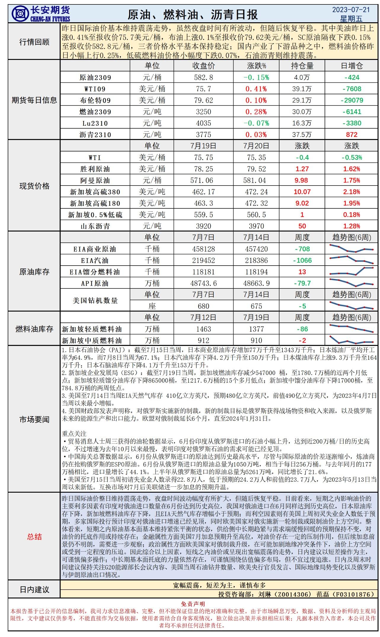 标题:长安期货7月21日原油日评:加息预期高涨对峙基本面托底,油价或维持宽幅震荡