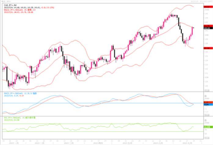 上周五(7月21日)美元兑日元上涨1.24%,报141.81,稍早一度触及141.95的7月10日以来最高。五位消息人士称,日本央行决策者倾向仔细研究更多数据,以确保薪资和通胀持续上升,再决定是否调整政策。报导并提到,在何时开始逐步退出刺激政策的问题上,央行内部没有达成共识,这可能会让下周的决定左右为难。现在似乎所有的预期都是他们将保持收益率曲线控制政策不变,利率也不会改变,但可能会稍微提升一下通胀预测。日本央行在利率方面若是继续按兵不动,那么势必要再次驱动套利交易风潮再起。日线图上,美元/日元逼近布林带通道中轨线,MACD信号线形成金叉,RSI开始上摆,显示美元/日元反弹仍在继续中。现在上方120日均线所在水平142.00附近成为关键的阻力,若继续冲破,前进的目标瞄向143-145水平。相反若不能冲破142阻力,则日元跌势有望得到缓和。