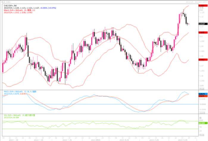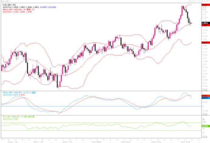 上周五(7月21日)欧元兑美元下跌0.05%,至1.1123。美元经过前一轮的下跌后,由于预期7月份的利率会议尚将会再次加息25个基点概率大大提高,近期美元有所反弹。而仅从通胀的角度来看,当前欧元区整体通胀压力仍要高于美国,而这也是令欧洲央行选择继续加息的重要原因,同时也是影响欧元兑美元表现的重要因素。未来,欧元是否还能相较于美元继续走强,还需要看欧央行与美联储货币政策路径的相对变化。如果美联储7月将是最后一次加息,而欧央行仍有余地继续降息以控制远高于美国的通胀,那么在加息这项货币政策上的博弈,将有可能推动欧元被动升高。短期内,从日线图上观察,目前欧元高位遇阻回落之中,技术指标MACD有形成死叉趋向,RSI自超买区域开始下降,显示欧元短线存在下落的风险。回落的话,初步支撑在1.11,更关键支撑的水平在1.1030-1.1000区域。