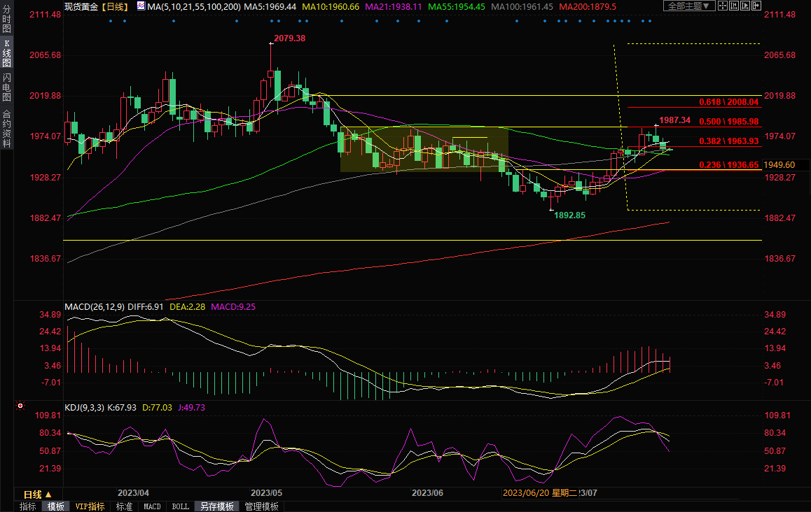 汇通财经APP讯——周一(7月24日)亚洲时段,现货黄金窄幅震荡,目前交投于1961.20美元/盎司附近;上周五金价下跌,为日线连续三个交易日下跌,因美国就业数据向好,打压了美联储接近结束加息周期的预期,美元指数持续反弹至逾一周高位,对金价压制明显。目前金价正考验100日均线附近和1960关口的双重支撑,若失守该关键位置,将增加金价大幅下跌的风险。
