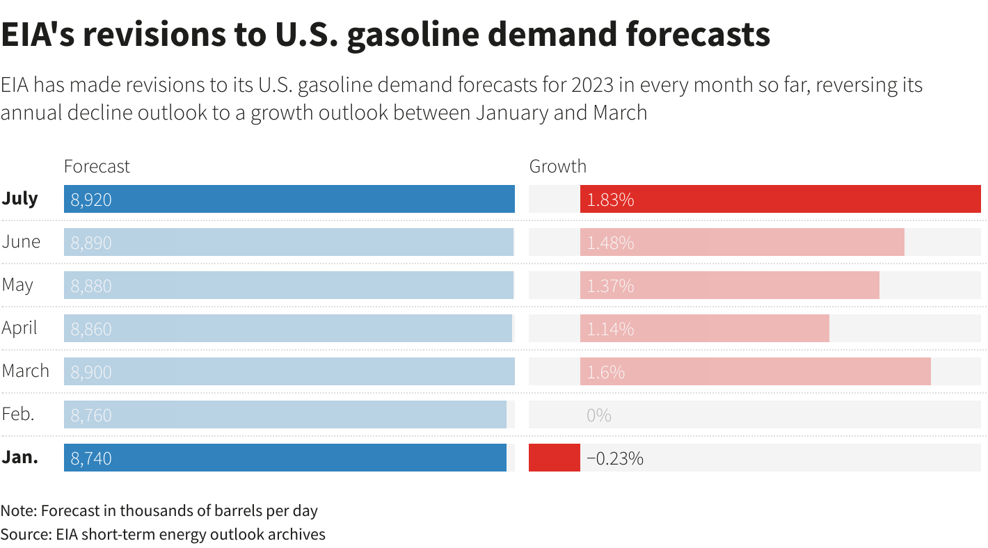 从那时起,疫情后向混合办公场所的过渡减少了通勤燃料需求。汽车能效标准不断提高稳步增加了每加仑汽油行驶的里程数,电动汽车(EV)销量的快速增长正在蚕食燃料消耗。俄罗斯入侵乌克兰后燃料价格飙升,也降低了需求。尽管如此,行驶在路上的汽车比以往任何时候都多,美国人购买的皮卡和SUV等高油耗汽车的数量也创下纪录新高。