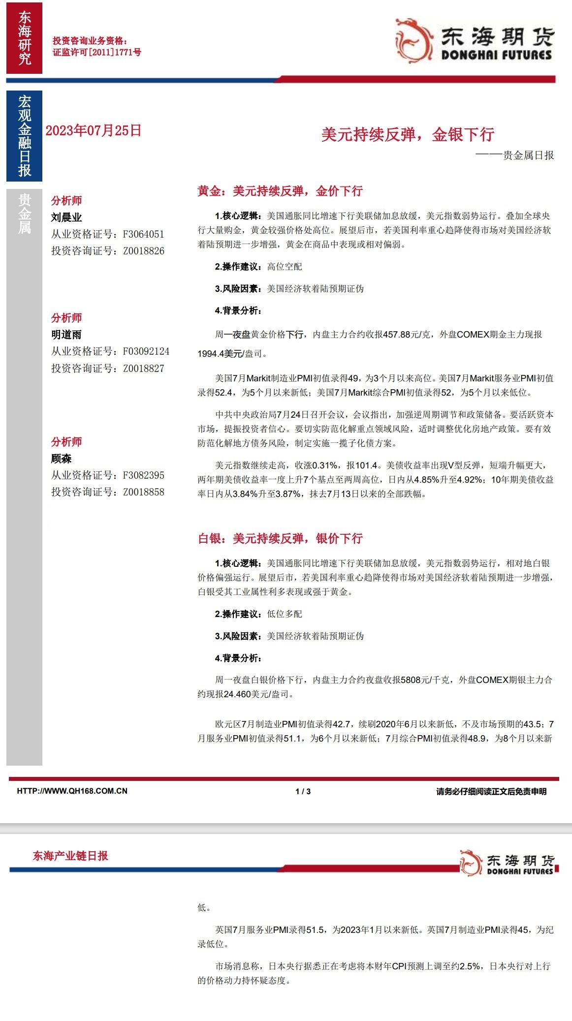 标题:【东海期货7月25日产业链日报】贵金属篇:美元持续反弹,金银下行