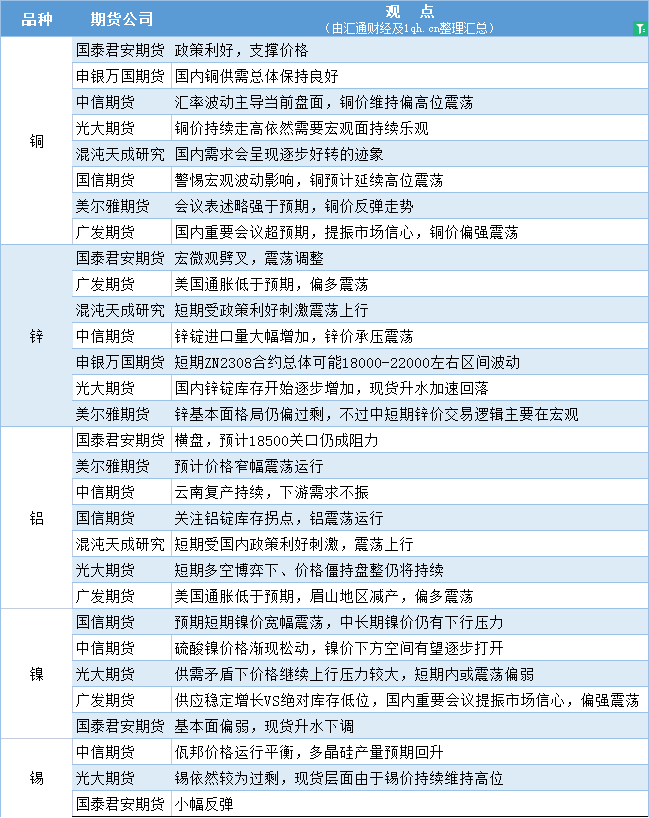 汇通财经APP讯——期货公司观点汇总一张图:7月25日有色系(铜、锌、铝、镍、锡等)