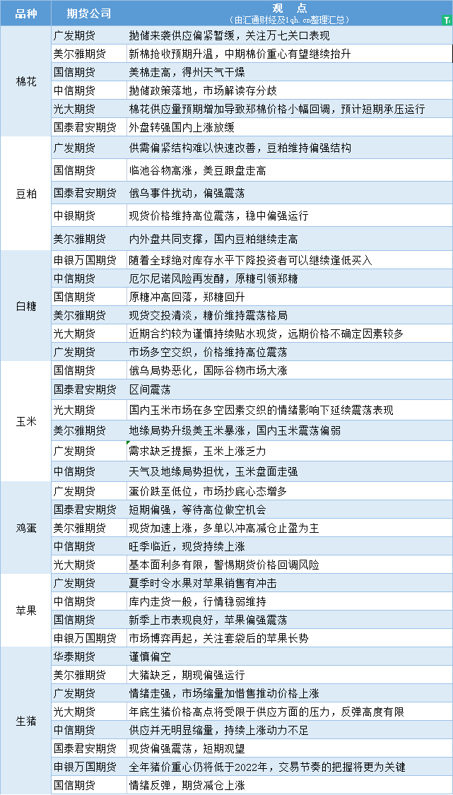 汇通财经APP讯——期货公司观点汇总一张图:7月25日农产品(棉花、豆粕、白糖、玉米、鸡蛋、生猪等)