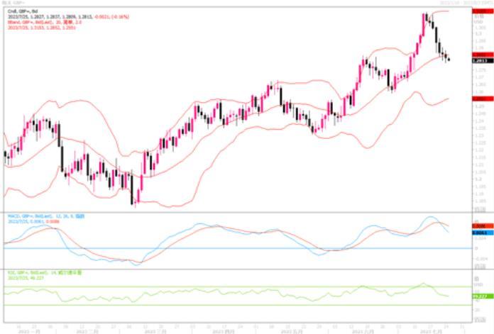 周一(7月24日)美元兑日元下跌0.22%,收盘于141.48。本周日本央行也将召开利率会议。尽管日本央行的官员们似乎仍保持着维持宽松的态度。但交易员们似乎觉得在这三大央行中,日本央行最有可能宣布引发市场波动的意外决定,交易员称,市场认为日本央行将有可能调整其收益率曲线控制(YCC)政策。如果日本央行最终果然有所行动的话,无疑将会引起日元的剧烈波动。因此,汇市上日元的交易似乎有提前为此做准备的动向。日线图上,美元/日元此轮反弹目前遇阻于布林带通道中轨线。4小时图上,MACD信号线出现粘连,RSI也从超买区域有所回落,美元继续冲高力度开始减弱。在欧美日三大央行会议出炉结果之前,料美元/日元的交投将变得谨慎。