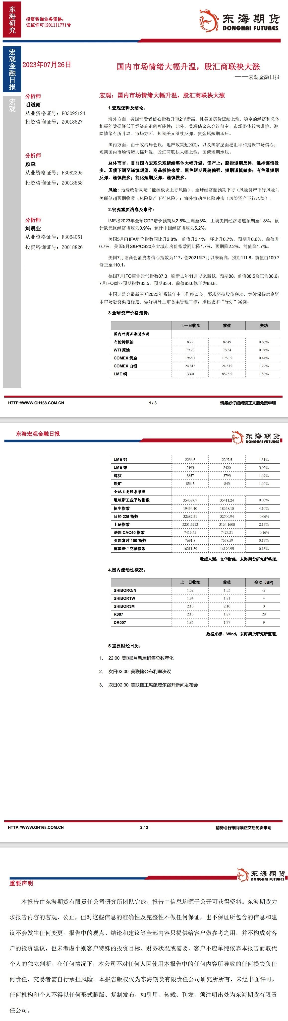 标题:【东海期货7月26日宏观金融日报】:国内市场情绪大幅升温,股汇商联袂大涨