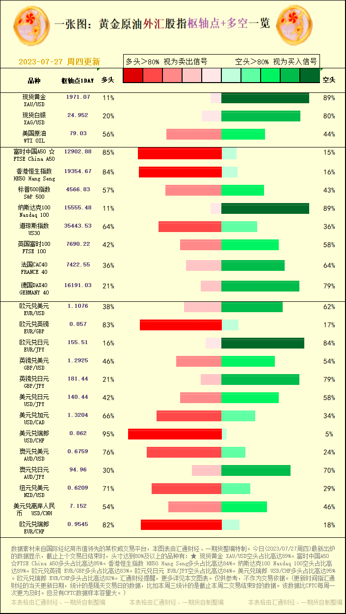 标题:一张图:2023/07/27黄金原油外汇股指"枢纽点+多空占比"一览