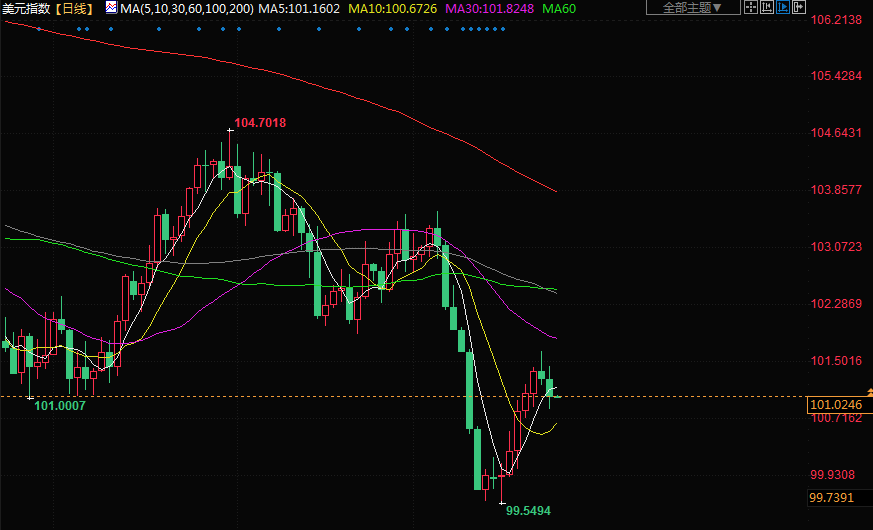 美元指数下跌了0.345%。期货市场走势显示,投资人预计美联储的隔夜利率将在2024年6月之前保持在5%以上,分析师称,联邦公开市场委员会(FOMC)会议一如预期,主席鲍威尔对未来利率前景的看法“接近中间立场”,介于鹰派和鸽派之间。