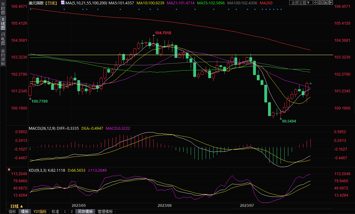 美元指数周四上涨0.72%,为3月15日以来最大单日涨幅,盘中最高触及101.84,为7月11日以来新高,收报101.75,上方关注100日均线102.43附近阻力。