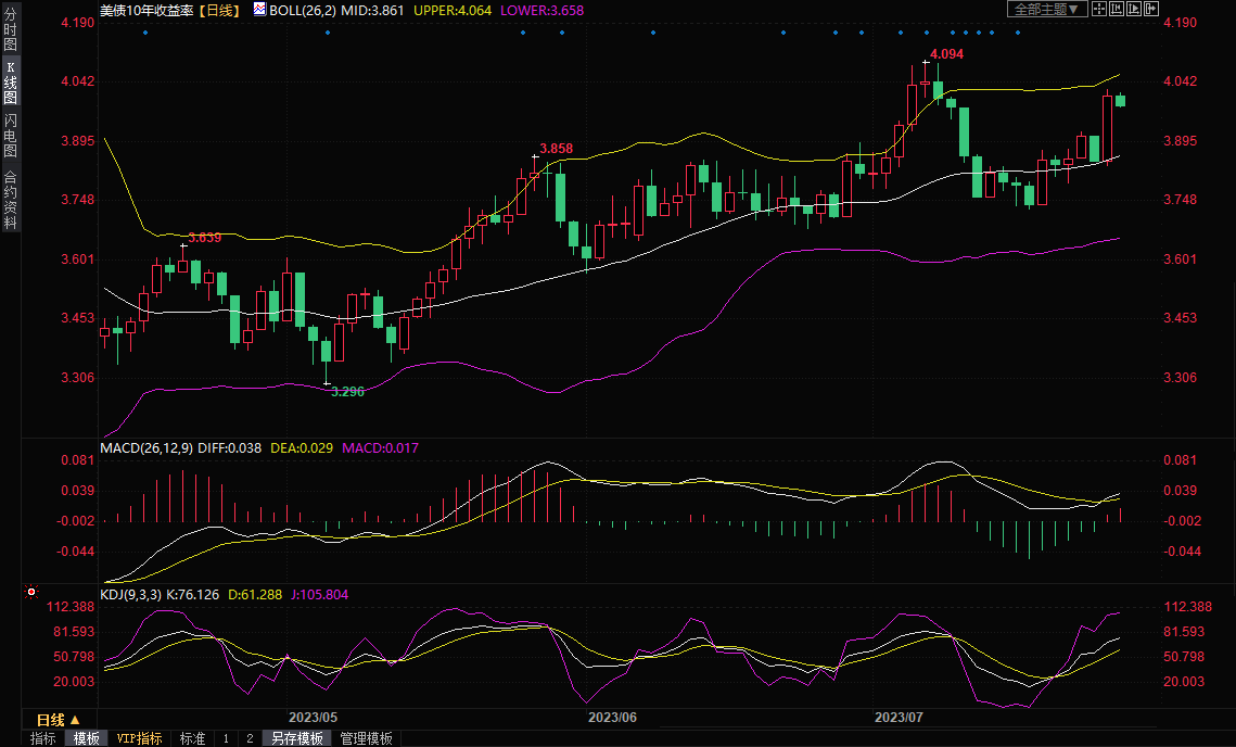 美国两年期国债收益率周四一度触及两周高点4.953%,尾盘上涨11.4个基点,收报4.939%。10年期收益率周四攀升至4.024%,创两周新高,尾盘报4.014%,上涨16.5个基点。