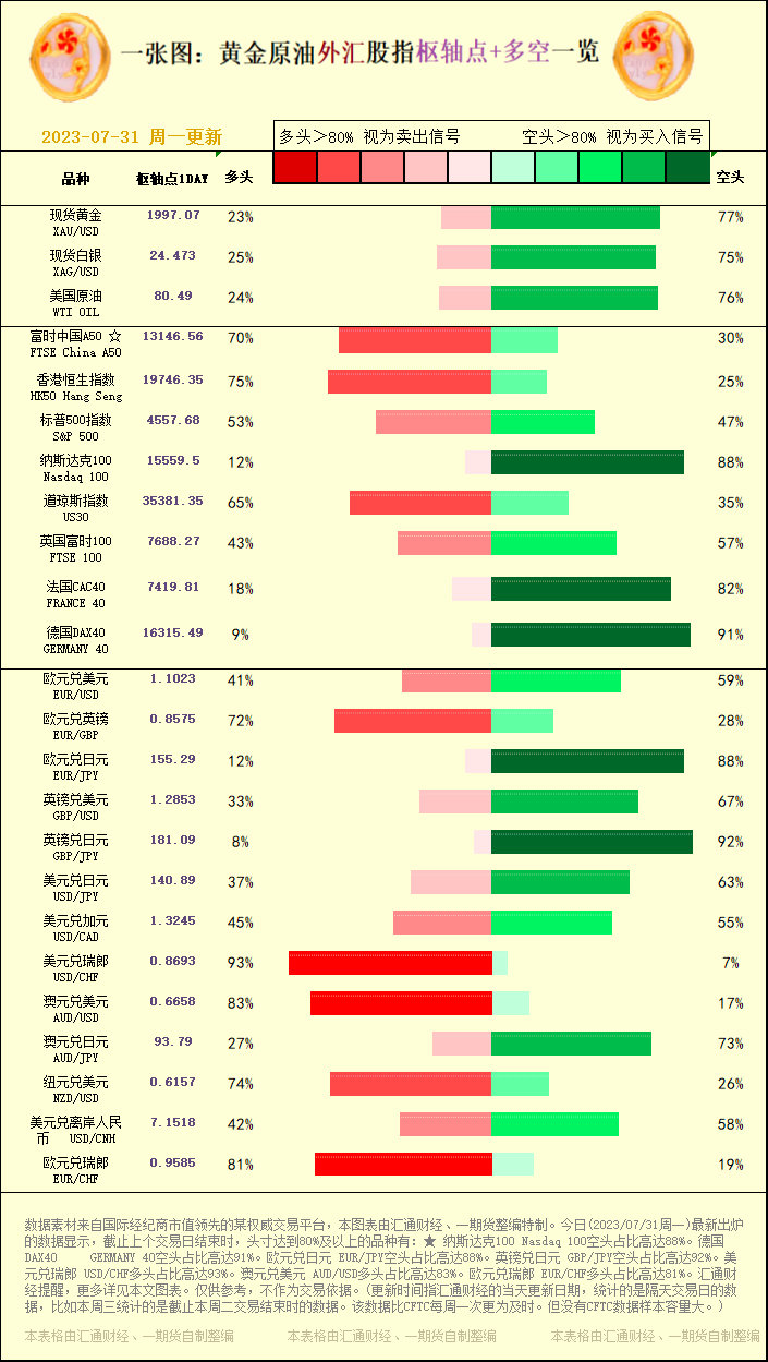标题:一张图:2023/07/31黄金原油外汇股指"枢纽点+多空占比"一览