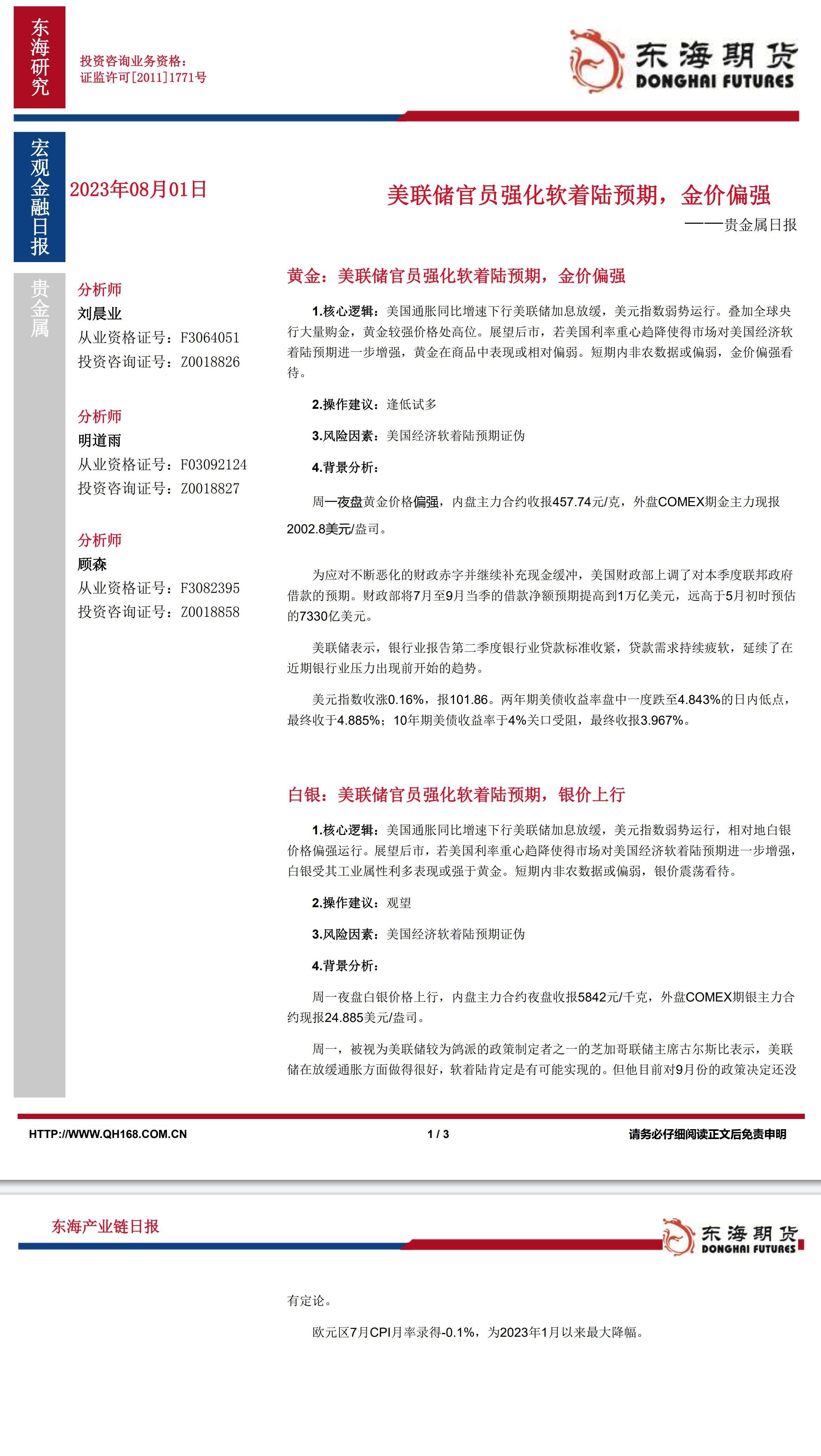 标题:【东海期货8月1日产业链日报】贵金属篇:美联储官员强化软着陆预期,金价偏强