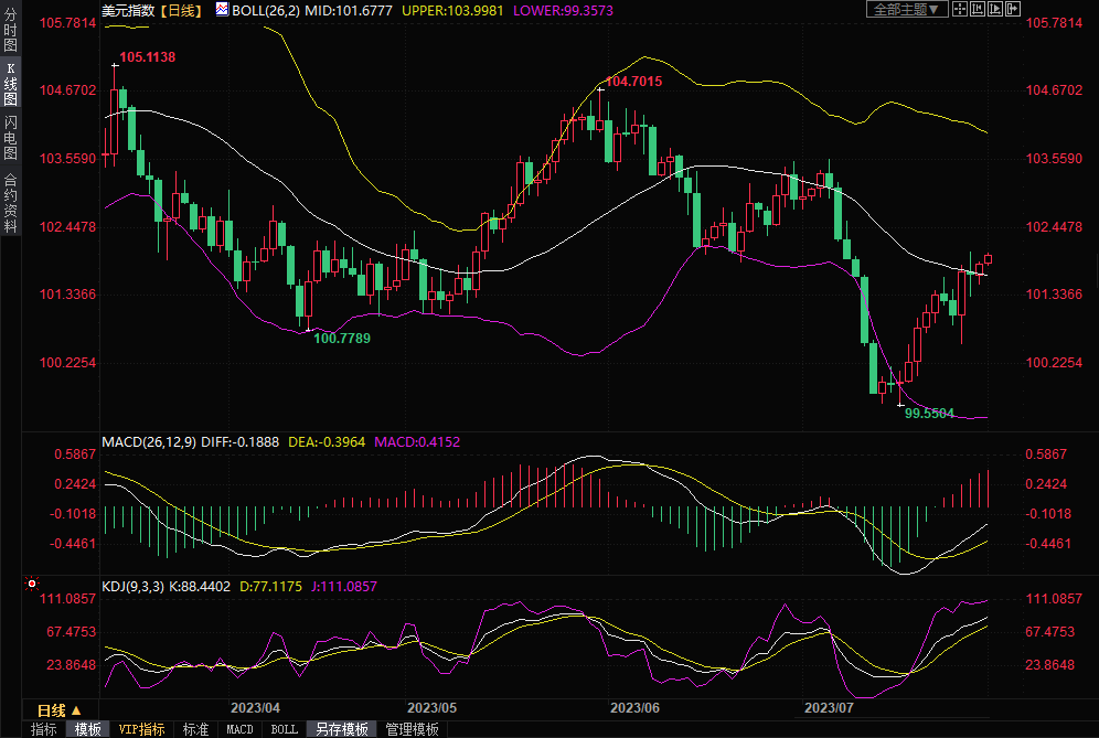 整体来看,通胀增速放缓的迹象,使得市场保持对美联储和多数央行接近加息周期尾声的预期,包括一些对经济衰退的担忧,仍给金价提供支撑。但很多投资者对美国经济数据包括7月份非农数据(周五将出炉)的预期也比较乐观,美元指数仍持续反弹,金价仍承压于100日均线,需要提防金价的短线下行风险,关注1950关口和布林线中轨1943.76附近支撑。北京时间10:15,