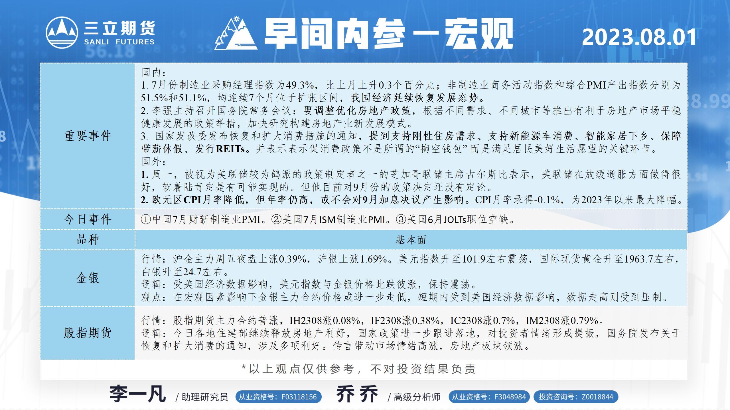 汇通财经APP讯——三立期货早间内参显示,受美国经济数据影响,美元指数与金银价格此跌彼涨,保持震荡。在宏观因素影响下金银主力合约价格或进一步走低,短期内受到美国经济数据影响,数据走高则受到压制。三立期货授权文本由“专注期货开户交易及专业行情分析资讯网站”【一期货 www.1qh.cn】转发。