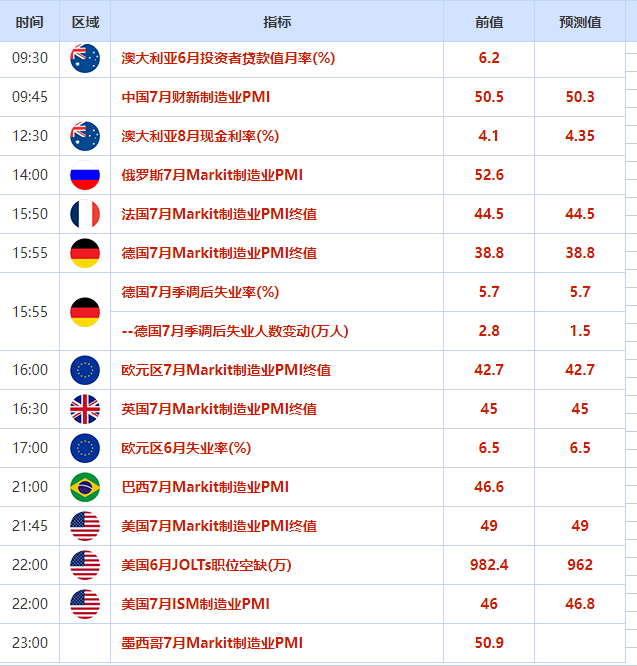 在亚洲其他地区,周一的数据显示,中国制造业活动在7月连续第四个月下滑,不过有消息称亚洲大国将采取进一步措施刺激经济复苏,令澳元和中国股市受到提振。此外,市场普遍预计澳洲联储周二将加息25个基点,也给澳元提供支撑。