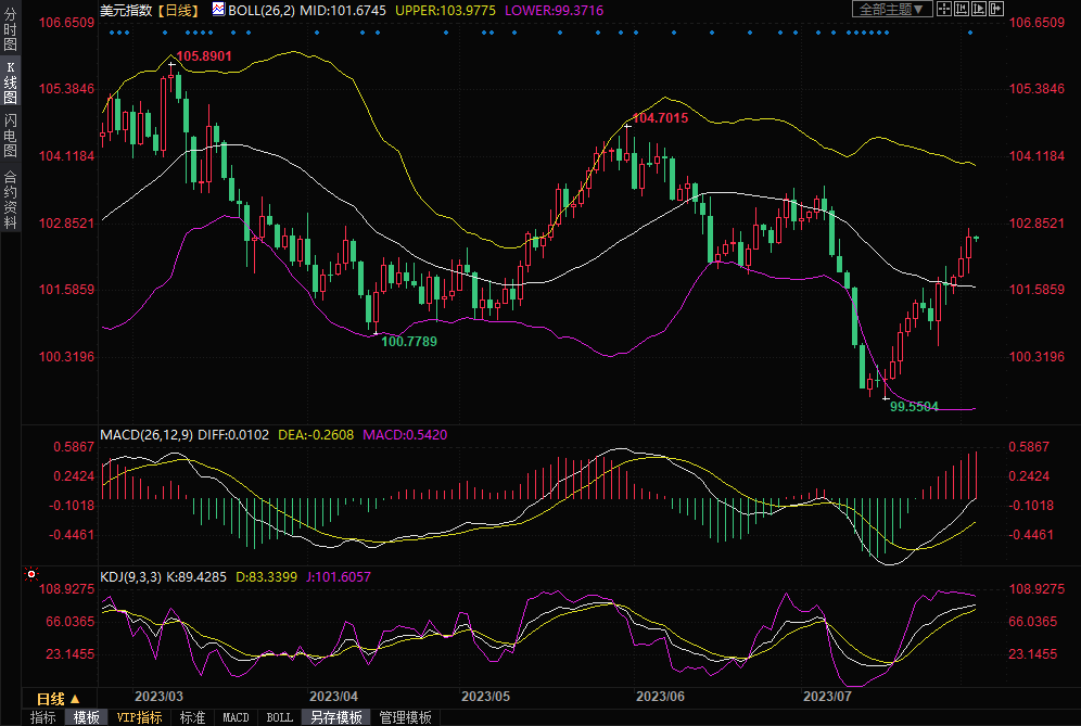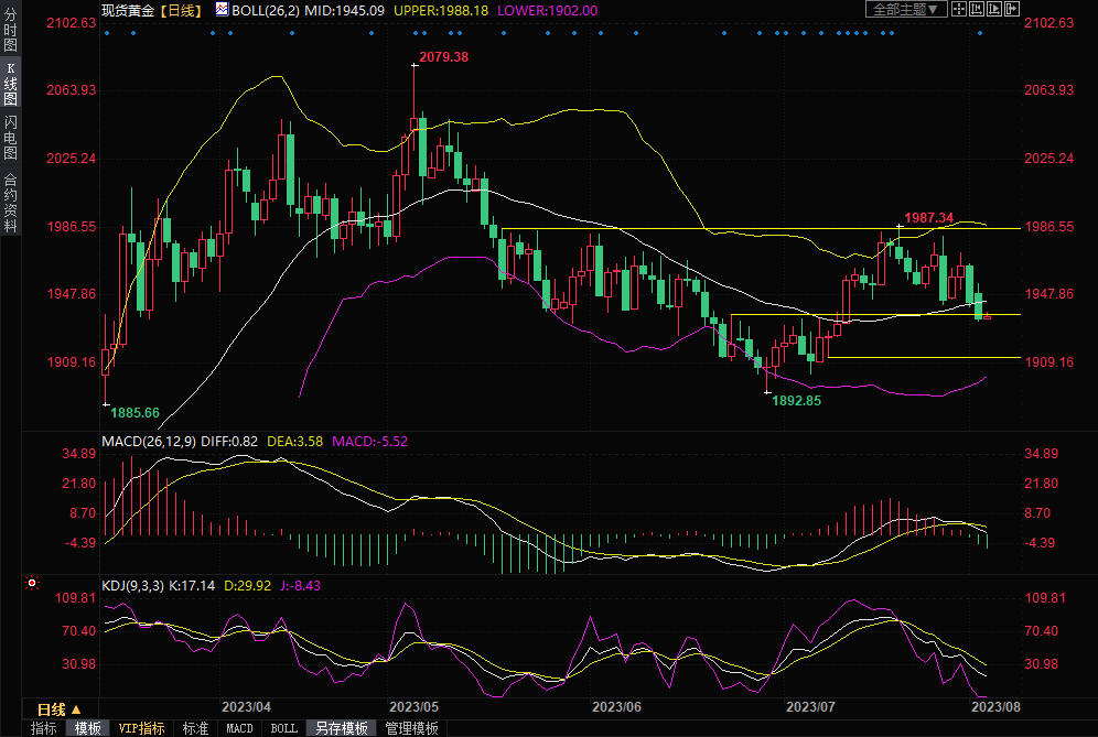 整体来看,惠誉下调美国评级和俄乌地缘局势对金价的支撑比较有限,市场对美国经济前景的预期比较乐观,美联储年内再加息一次的预期有所升温,美元和美债收益率表现强势,而且仍有进一步上涨机会,这对金价打压明显,英国央行的加息前景也略微对金价不利。金价目前已经失守布林线中轨1945附近关键支撑,短线看空信号有所增强,后市偏向进一步震荡下行,可能会重新跌向1900关口;短线的话,留意1930关口和7月10日低点1912附近支撑。北京时间10:09,