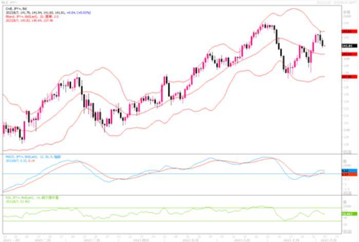 上周五(8月4日)美元兑日元连续第二个交易日下跌0.54%,报收于141.75。美元因周五非农就业职位增长低于预期走低,日元继续获得上升动能。此外,在日本央行上周出人意料地调整货币政策后,交易员们正试图判断日本央行将让日本公债收益率以多快的速度攀升、攀升至多高水平。因为日元公债收益率与美国公债收益率差一直是前期主导美元/日元走势的影响因素,日元对此也是相当敏感。如果一旦开启日本公债收益率有望与美国公债收益率缩窄的过程,或有望驱动日元持续的回升之旅。日线图上,美元/日元受阻于144之下,虽然汇价仍处于20期均线上方,但技术指标开始呈现回落态势。短线4小时图上,美元/日元回落短期均线下方,技术指标呈下摆态势,显示短线美元兑日元有回落走势倾向。下方初步支撑在141,进而是139.80。上方目前看144以及145水平处的阻力较大,不易穿破。